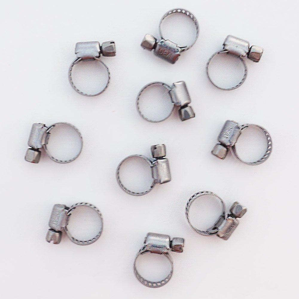 Reusable perforated band clamps to crimp bev tubing to barbs. Clamp fits 3/16, 1/4, or 5/16 ID beverage tubing. Requires a small flat head screwdriver or a hex nut driver to install.